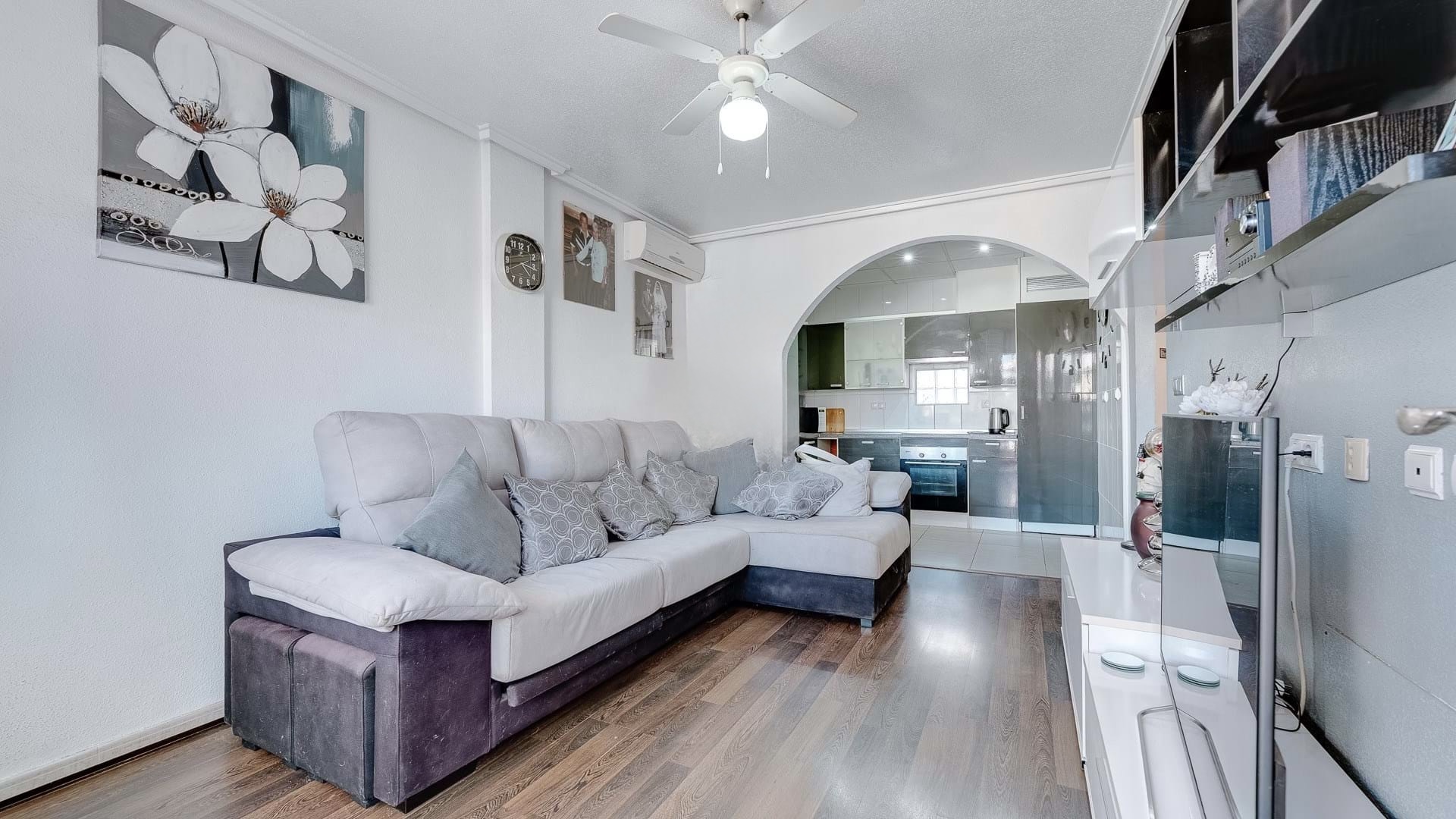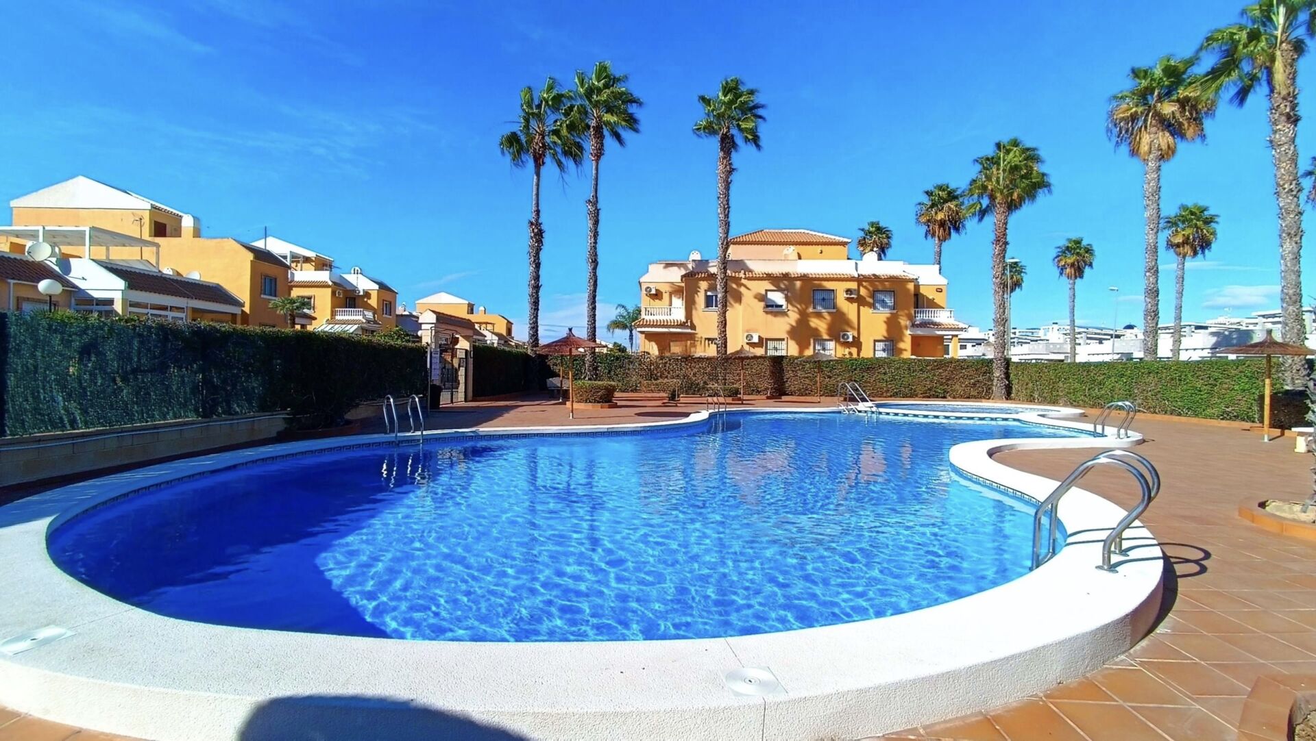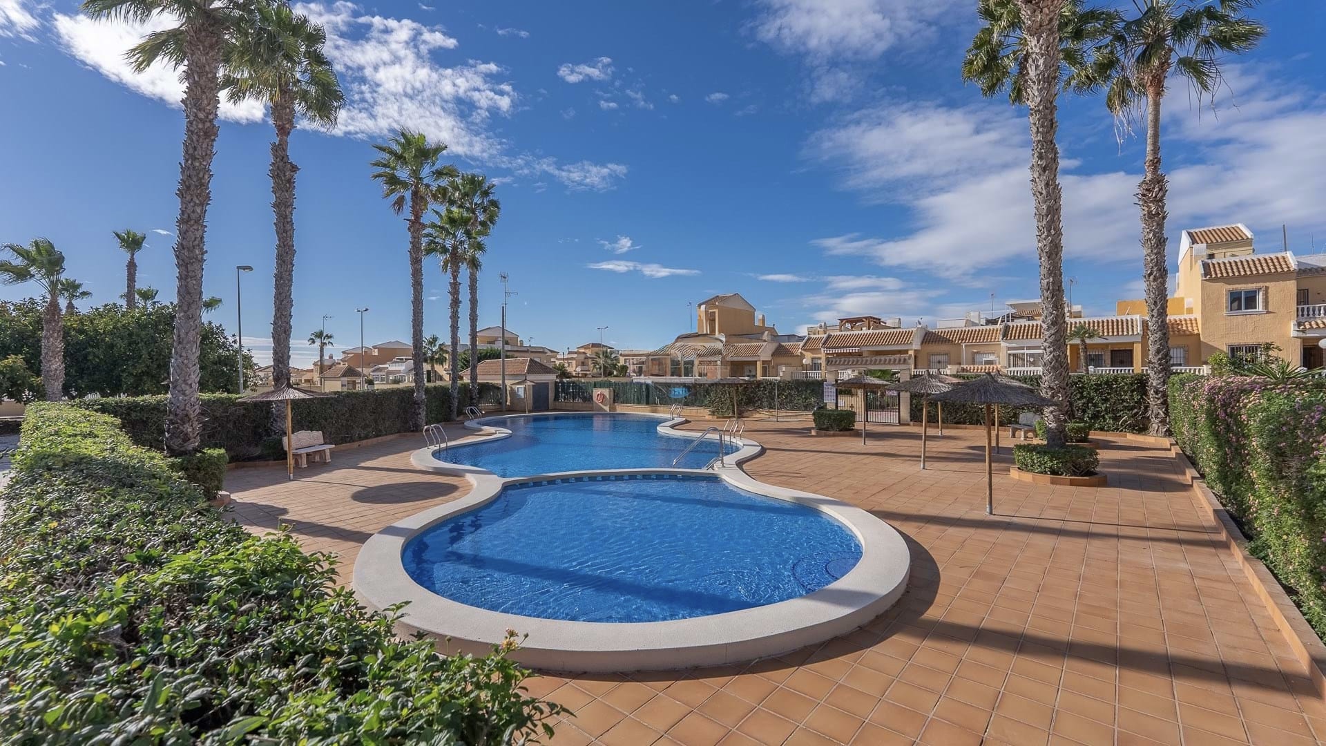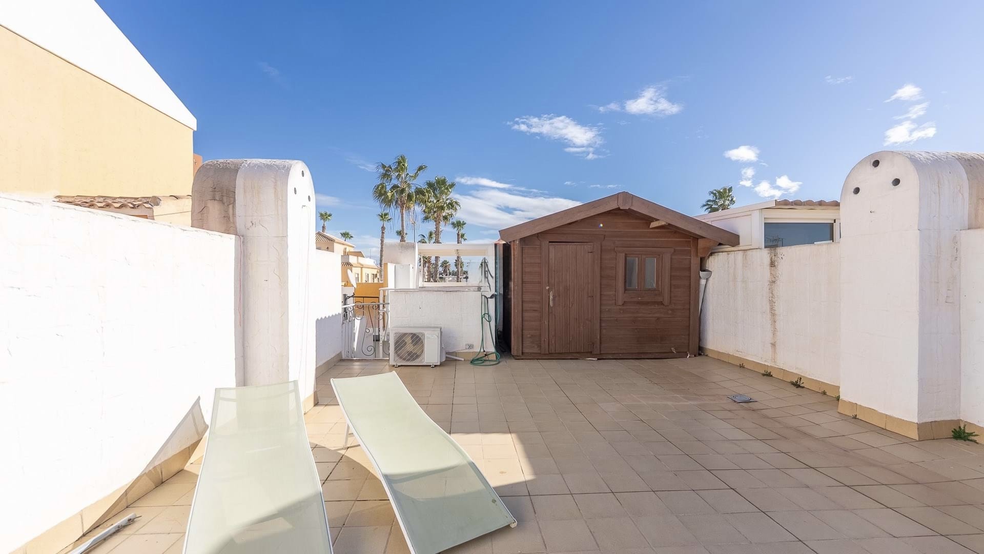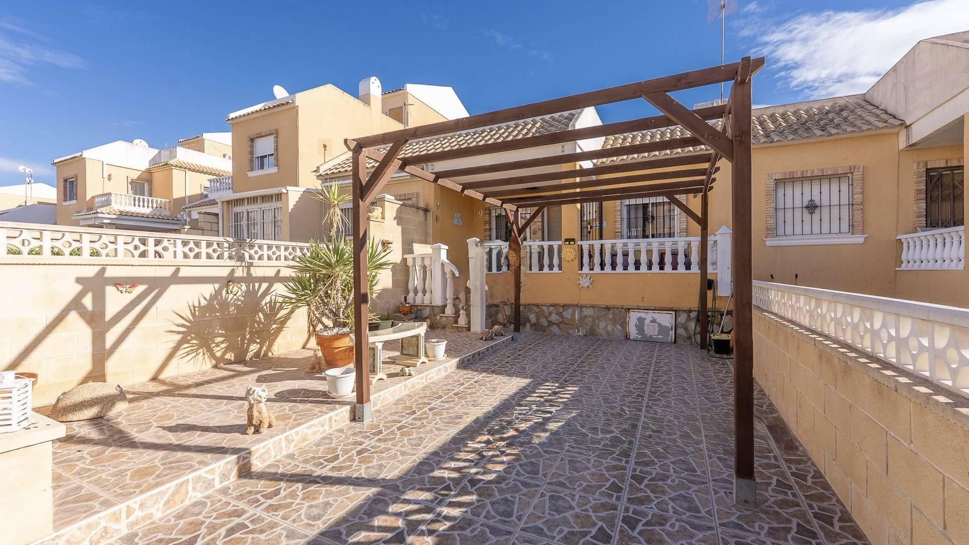 Okouzlující řadový dům orientovaný na západ se soukromým soláriem, společným bazénem a prostornou terasou ve vyhledávaném městečku Cuidad Quesada.